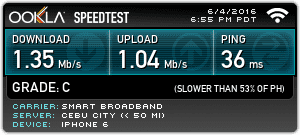 Average Upload Speed: 1.51 Mbps (Smart Bro) | 0.50 Mbps (Globe Tattoo)