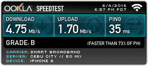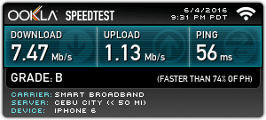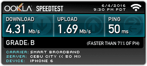 Average Download Speed:4.93 Mbps (Smart Bro) | 7.30 Mbps (Globe Tattoo)