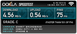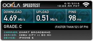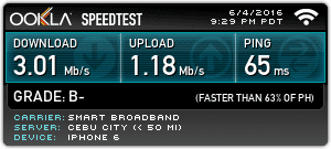 Average Download Speed: 4.08 Mbps (Smart Bro) | 3.01 Mbps (Globe Tattoo)